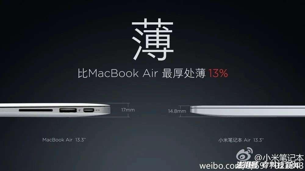 其次,在发布会的产品对比环节,小米把Air的最薄处和苹果MacBook Air的最厚处做对比,表示小米Air的厚度更薄。这番田忌赛马的表演自然成了被喷的焦点之一。