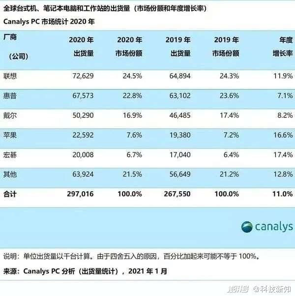 Canalys数据显示,2020年全球笔记本出货量为2.351亿台,台式出货量6190万台。预计今年一季度个人电脑出货量增长将同比达到峰值,2021年全球个人电脑出货量将增长8.4%,达到4.968亿台,台式、笔记本和平板的出货量都将增长。到2022年,全球PC市场出货量将超过5亿台。Canalys的研究总监Rushabh Doshi表示,在2020年的繁荣之后,PC行业将在未来几年继续增长。