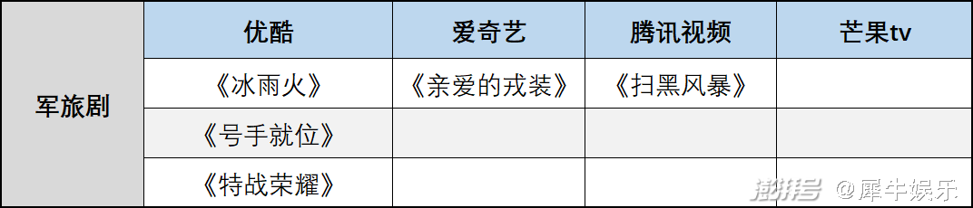 在这样的情况下,优爱腾芒在Q2季度预计播出的军旅剧达到了三部,分别是《特战荣耀》《号手就位》和《亲爱的戎装》,公安题材的剧集有《冰雨火》和《扫黑风暴》两部。