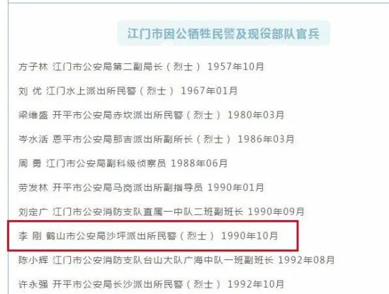 江门市因公牺牲民警及现役部队官兵(部分)1990年10月23日下午2时多,李刚与另一名民警在沙坪镇长塘二街巡逻时,发现两名可疑人员提着物品、满头大汗,神色慌张,李刚与同事立即上前表明身份,进行盘查。两名可疑人员拒绝盘查,拔腿逃跑。李刚与同事立即驾驶摩托车追击,迅速制服了其中一名嫌疑人员。在将该嫌疑人员移交给同事后,李刚继续孤身追击另一名逃窜的嫌疑人员。在连追两个街口,跑出200多米后,李刚同在新湖路与人民东路交界处追上了嫌疑人员,并抓住了他的右臂。谁料,嫌疑人员用力挣脱,突然从裤袋里掏出“五九式”手枪向李刚胸部开了枪。中枪后的李刚同志仍顽强地扑向匪徒,最终,由于被击中要害,李刚英勇地倒下了……