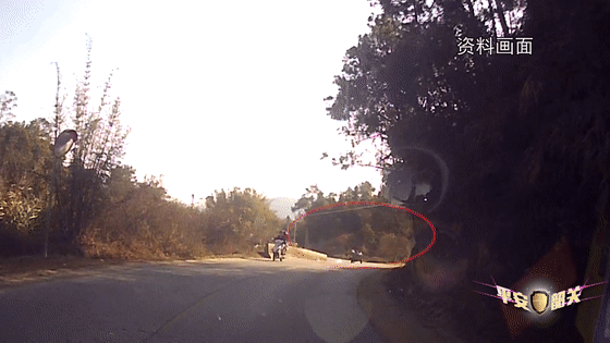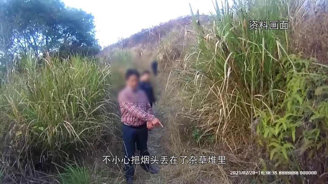 据其他车辆记录仪显示,一辆摩托车在X347县道上正常行驶,坐在后座的一名年轻男子突然随手点燃一根冲天炮扔向公路,冲天炮随即飞向旁边山林,而这里正是山火的着火点。