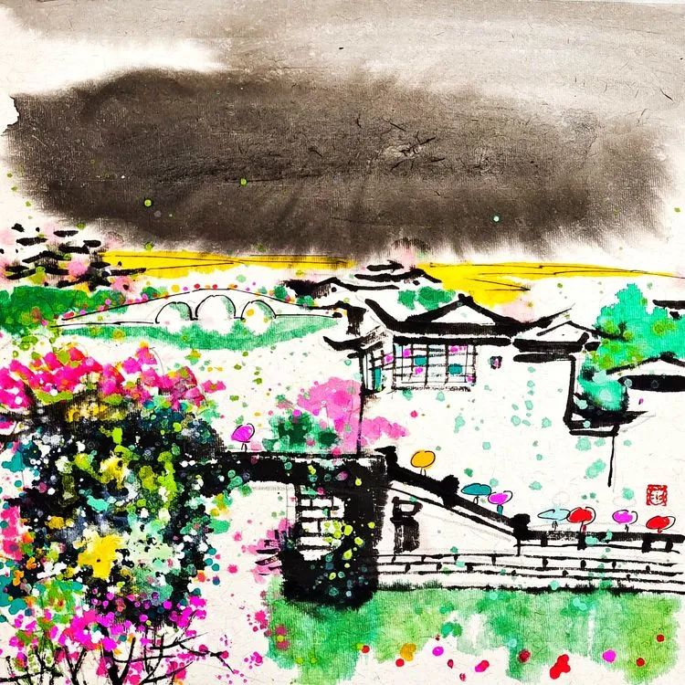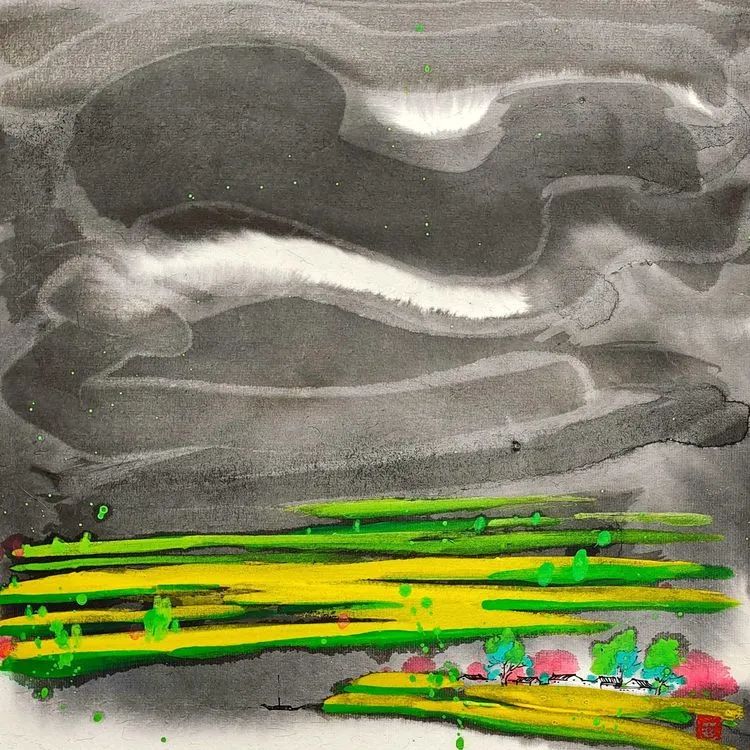 前几天落雨,外出见一景,乌云下的菜花田显得格外明亮,晨课,凭印象画之……��