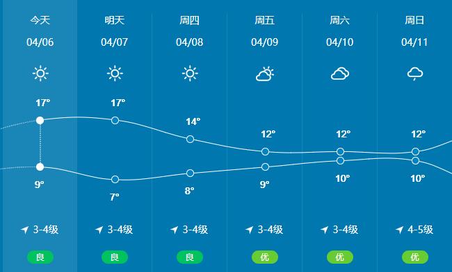 本周,我市以晴到多云天气为主,11日全市有降雨。最低气温市区及沿海地区5~9℃,内陆地区1~9℃,最高气温市区及沿海地区13~15℃,内陆地区14~22℃;南风短时北风,风力3~4级。