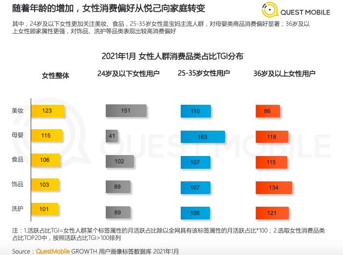 从QuestMobile《2021她经济洞察报告》也可以看出,36岁及以上女性的主要花销,除了母婴、洗护和食品之外,美妆和饰品都榜上有名,其中饰品占比最高。这样的答案多多少少有些出人意料,但又在情理之中。如何“优雅地变老”,成了妈妈们现阶段最大的梦想。