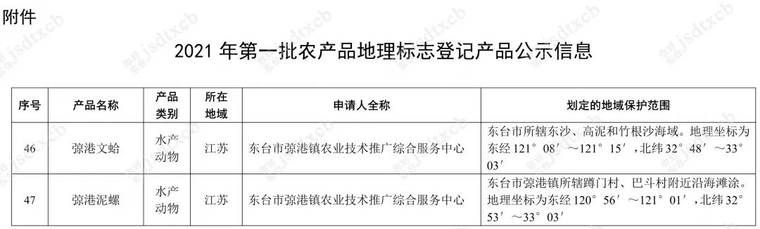日前,国家农业农村部对2021年第一批农产品地理标志登记产品进行公示,东台“弶港文蛤”“弶港泥螺”名列其中。据悉,上述产品正式批准登记后,我市国家地理标志农产品总数将增至9个,居全省县级首位。