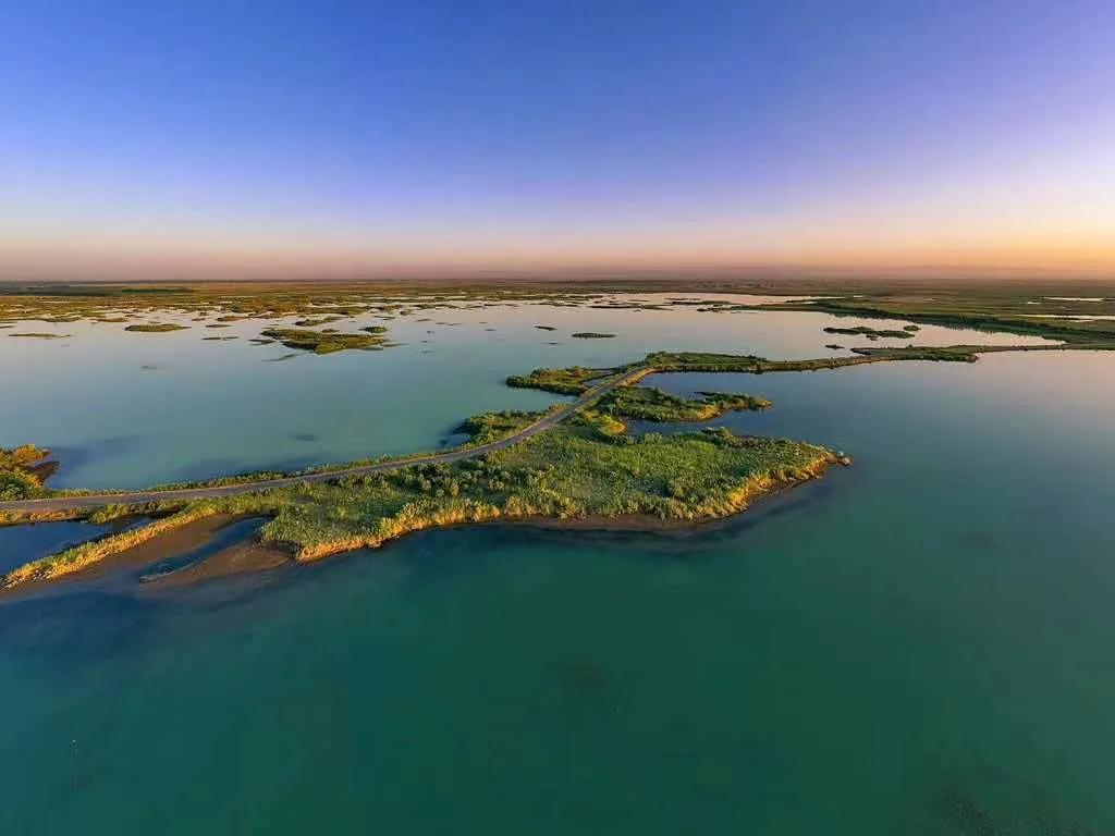 “拉里昆”湿地地处墨玉县雅瓦乡境内,被当地百姓称为“郁金香的湖泊”。湿地面积约16万亩, 水面面积约1.3万亩,水源主要来自喀拉喀什河。拉里昆湿地作为重要的生态屏障,减缓了风沙对皮墨垦区绿洲的侵袭,其生态功能具有不可或缺性和不可替代性。这里景观资源丰富,野生动植物种类众多,是集水库湿地、芦苇沼泽、沙漠景观为一体的观光点,特别是沙漠风光和大片芦苇沼泽水域紧密相连,形成黄色沙漠与碧水植物的鲜明对比,这些更显得风光独特、珍贵无比。