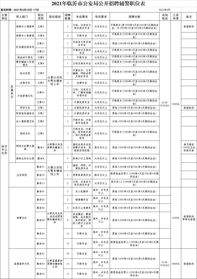 1、2021年临沂市公安局公开招聘辅警职位表