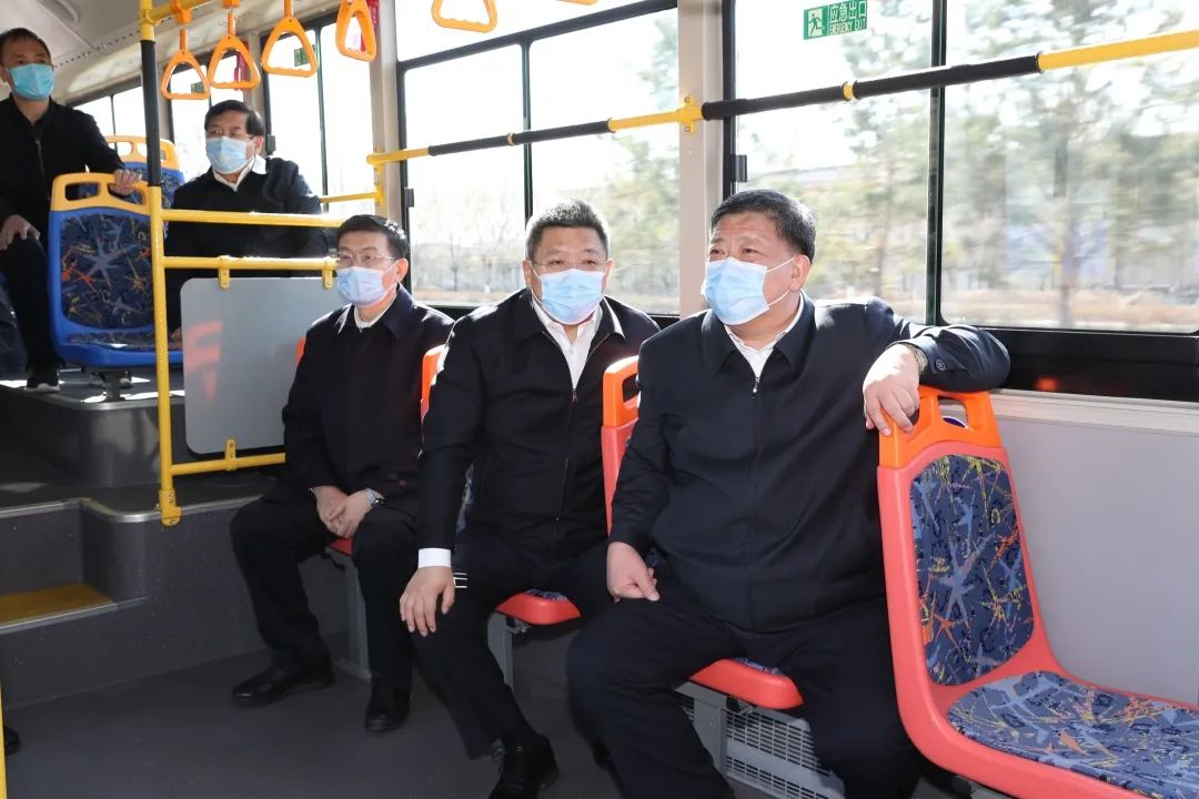 姜治莹一行乘坐刚投入运营的氢动力公交车,了解车辆性能和上线运营情况。