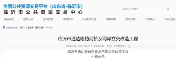 临沂市通达路祊河桥及两岸立交改造工程,由山东易方达建设项目管理有限公司代理招标,于2021年03月31日开标,于2021年03月31日定标,确定中标单位为:临沂市政集团有限公司;中标价:1370673372.11元;工期:540日历天;质量标准:合格。