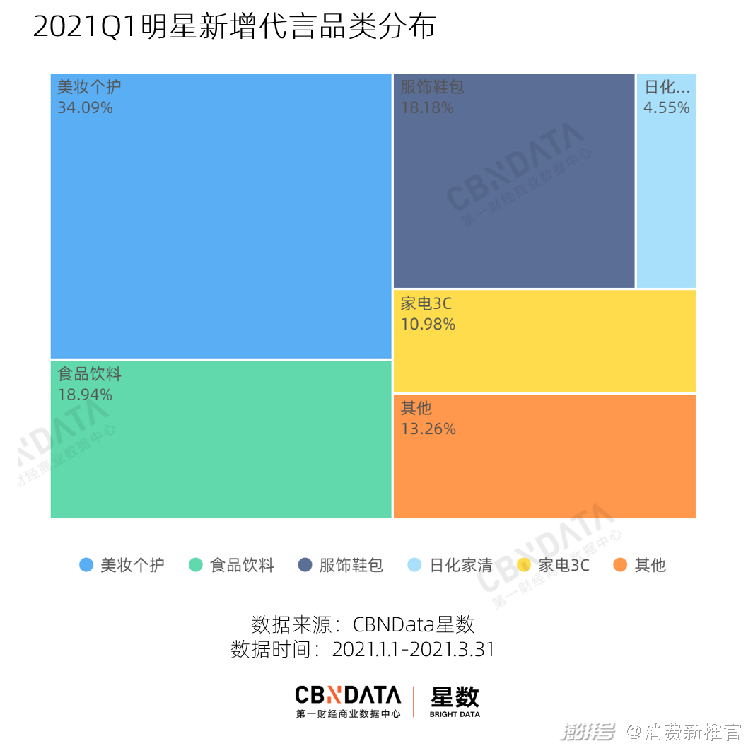2021第一季度,明星新增代言数量260+,其中3月份是主要官宣月份。从品类来看,美妆个护、食品饮料、服饰鞋包成为新增代言数量最多的品类,占据整个季度新增数量的70%。