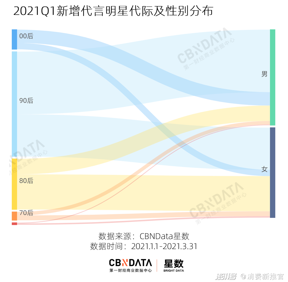 从代际与年龄分布来看,80后、90后明星仍是品牌青睐的主要群体,但在性别分布上,90后、00后男明星优势明显,女明星则数80后更为能打。