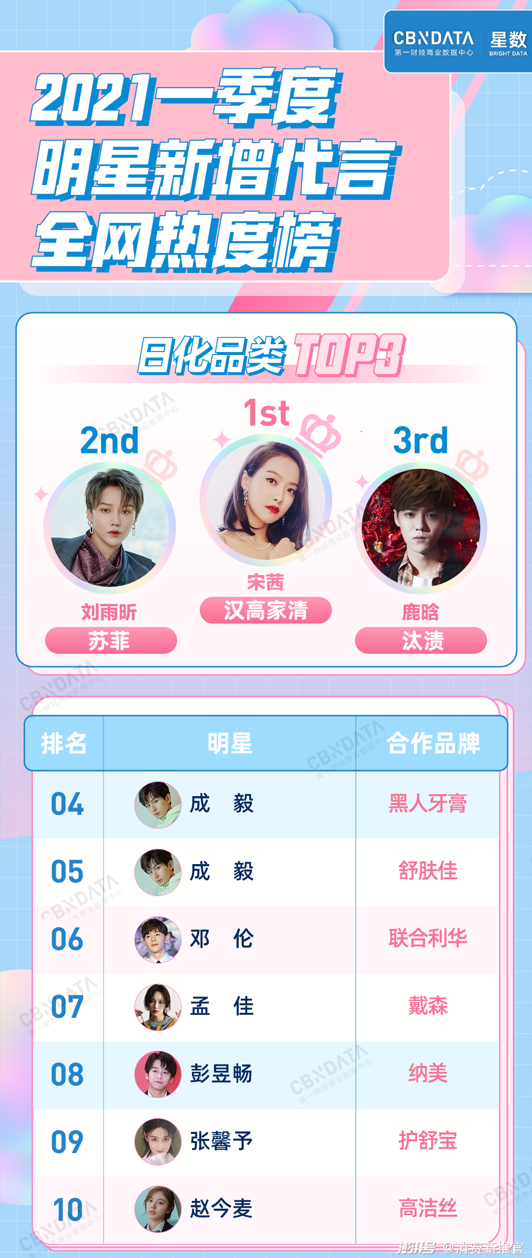 一季度,华晨宇与雪碧的合作升级,成为其全球品牌代言人,仅凭这一项代言,华晨宇便强势登顶TOP1,可见负面舆论似乎并未对华晨宇造成重大影响;作为2021年官宣的首个代言,王源和豆本豆的合作显然得到了粉丝们的大力支持,拿下了人气榜亚军位置。