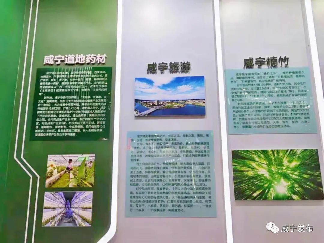 咸宁展馆位于武汉国际博览中心A2区域特色馆,分“咸宁生态、咸宁文化、咸宁温泉、咸宁茶叶、咸宁桂花、咸宁楠竹、咸宁旅游、咸宁道地药材”八个版块进行宣传推介、对接客户资源。咸宁市共组织40家企业参展,包括19家绿色产品、食品、饮品、健康日用品参展企业和21家文化旅游、康养、体育、医药等宣传推介企业。