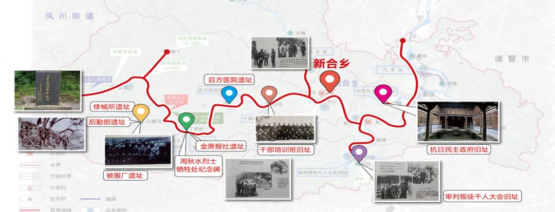 金萧支队纪念馆、新民乡抗日民主政府旧址等红色景点悄然静立,诉说着这个革命老区的沧桑历史。金萧支队,主要是指抗日战争和解放战争期间,在金华和萧山一带活动的革命力量。金萧支队主要分为前金萧和后金萧。前金萧,新四军浙东游击纵队;后金萧,浙东人民解放军。