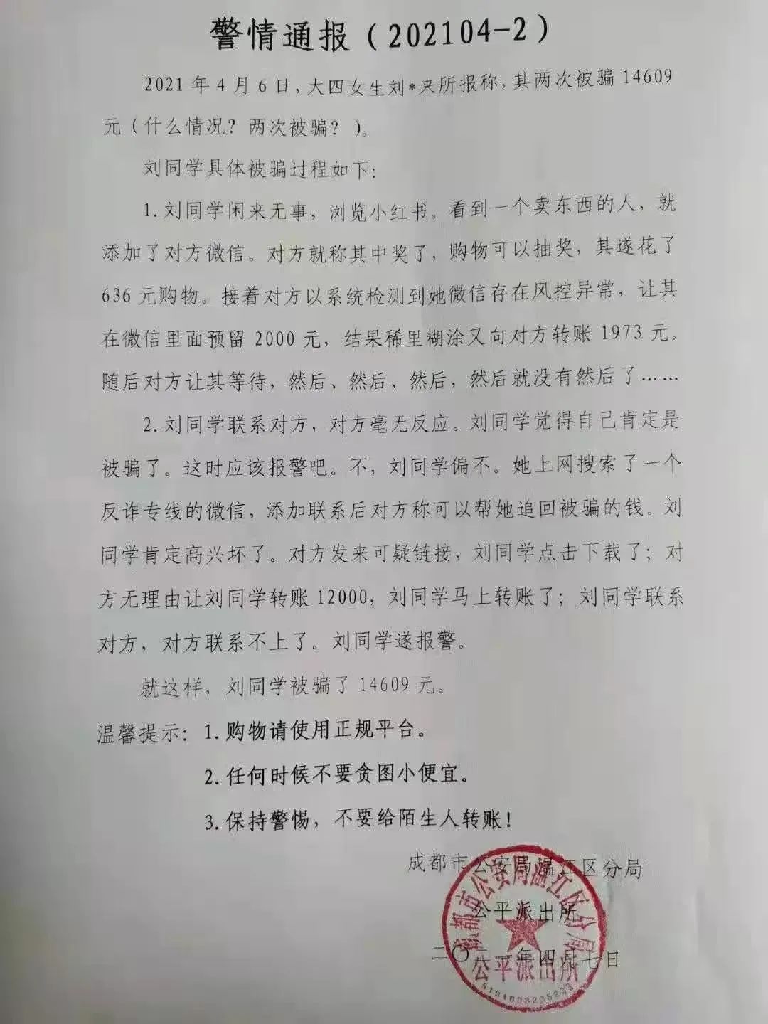 成都市公安局温江区分局公平派出所工作人员表示,刘某两次被骗后,才向警方报案。该所最近的确在四川农业大学发了这样的警情通报。由于受众是学生,所以用了口语化的语言。