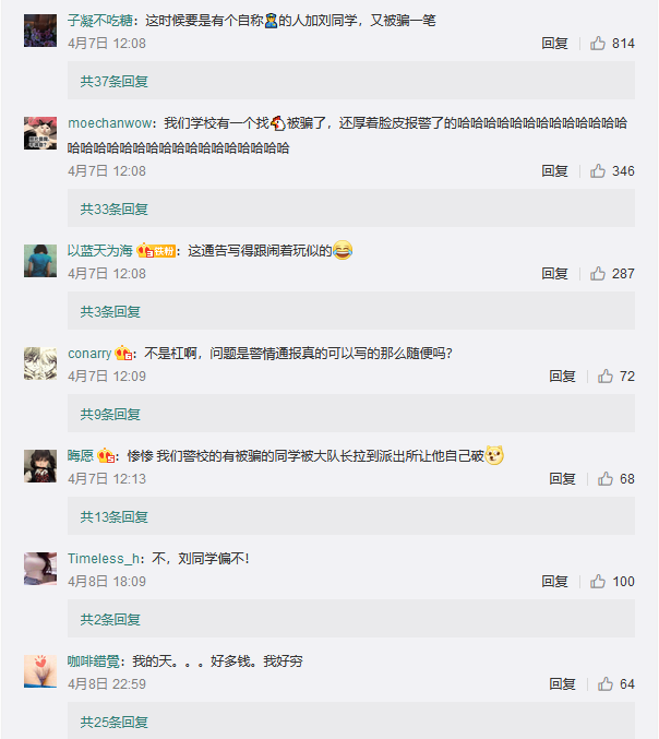 有网友跟帖表示,受害者是四川农业大学温江校区的同学。警情通报贴在校园的墙上,由于文本诙谐通俗,在同学中引发广泛关注。有同学感慨:“悲催的同学这是遭遇了谍中谍呀。”