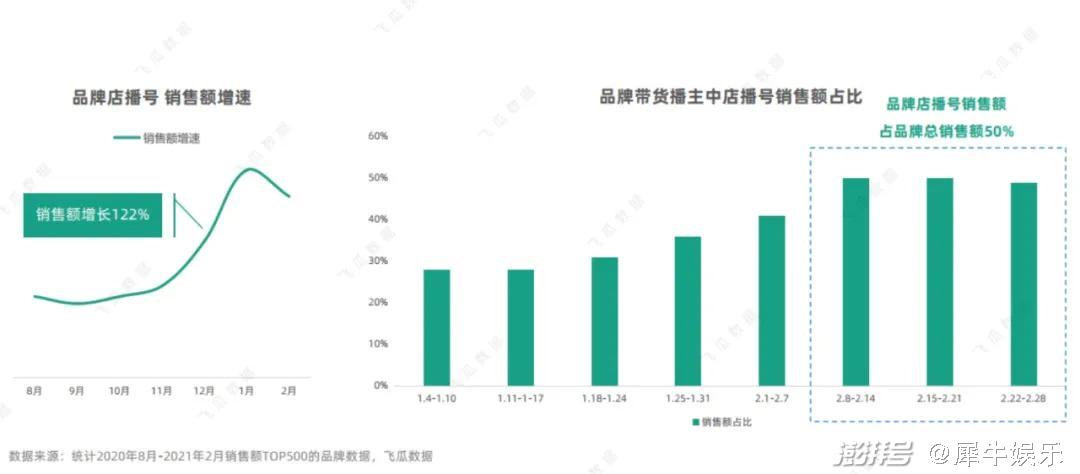 在这一方面,“品牌店播”是一个新生崛起的威胁力量。《飞瓜数据:2021年品牌店播趋势报告》中透露,2021年2月,品牌店播号同比1月增长了近一倍;截至目前,抖音品牌店播销售额稳定占总销售额50%以上。