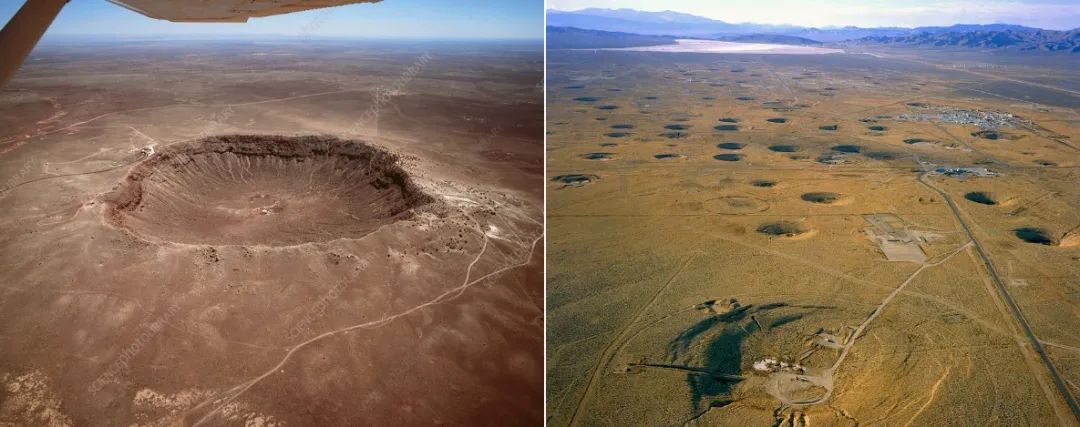 由于当时物理学对于高速碰撞的理解还不够深刻,因此上述认知在那个时代的确是符合直觉的。但随着对地球陨石坑(如 Meteor 陨石坑,下图左,来自 Science Photo Library);核爆弹坑,如下图右,来自洛斯阿拉莫斯国家实验室)以及月球环绕器获取影像的深入研究与形貌比对,撞击成因相关的实验与理论证据逐步完善。二十世纪中叶,撞击成因终于成为月球“环形山”成因的主流学说。