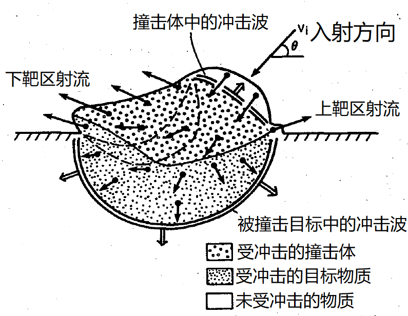 倾斜撞击接触过程的示意图,尽管入射角会使得整体成坑产生不对称性,但最终坑的圆度远没有低速撞击变化明显。(译自 Impact Cratering: A Geologic Process, by H.J. Melosh, 1989)