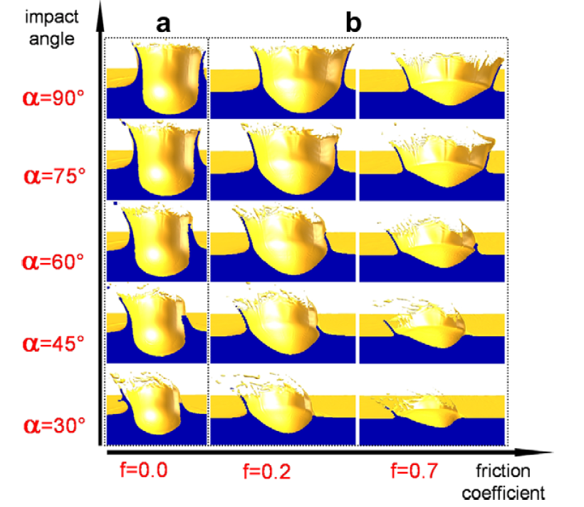 Elbeshausen et al., 2009, 10.1016/j.icarus.2009.07.018,对不同入射角(α)和不同材料强度(f,实际为仿真时颗粒间的摩擦系数)的高速撞击进行的模拟,可见在很大入射角范围内,都可以得到较圆的撞击坑