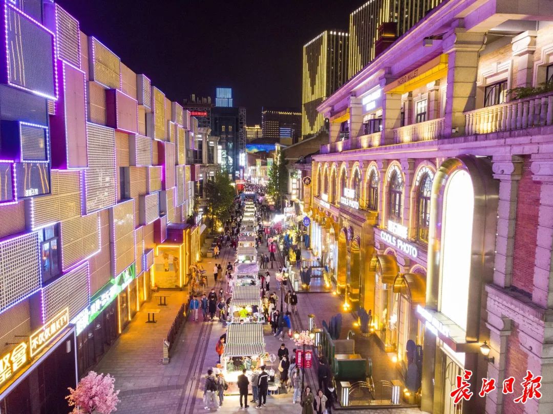 4月4日晚,夜幕下的武昌汉街流光溢彩,市民游客漫步街区,兴致盎然。长江日报记者苗剑 摄