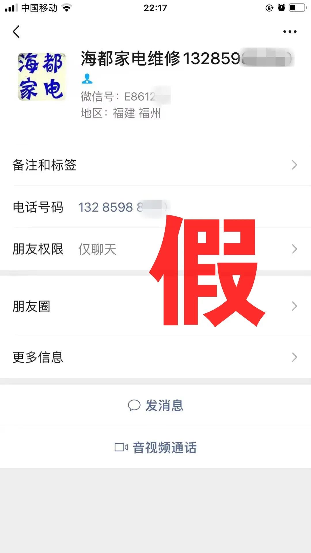 昨日,海都记者根据朱女士提供的联系方式,打通了这家“海都家电维修”商铺的电话。当记者询问是否和海峡都市报有合作关系时,对方回答“嗯”,并补充道,“海都是一个平台,大家都爱与其合作。”而记者又问店铺位置时,对方说:“店在哪里不重要,能为你上门服务就行。”