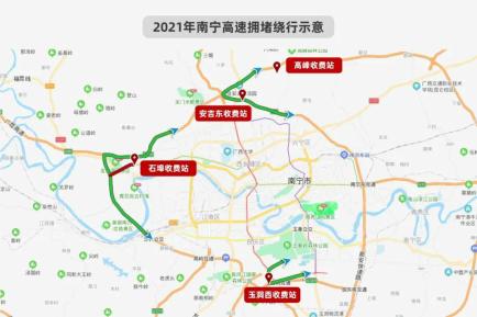 (二)G7201南宁绕城高速石埠收费站拥堵时:出城:可选择绕开石埠收费站,从南宁绕城高速安吉东、高峰、五塘、玉洞西收费站出城。