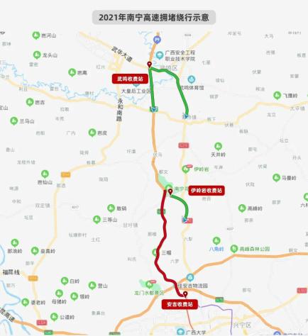 可以选择绕开伊岭岩收费站,选择南武城市大道通行,选择武鸣、府城、安吉等收费站通行前往目的地。