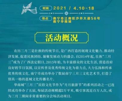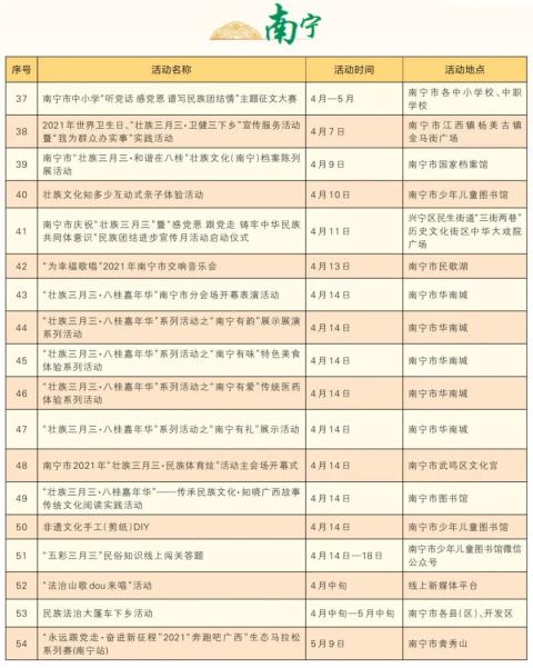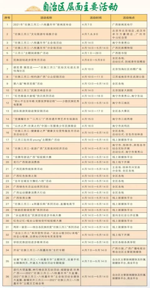 一.4月14日,防城港防城区十万山瑶族乡“三月三”民族风情活动,防城港市文化艺术中心“铸牢民族魂·永远跟党走”——防城港市三月三文艺演出,防城港市博物馆绣球文化展、非遗技艺展演、舌尖上的壮文化,桃花湖公园非遗文化集市、非遗文化展演,上思布透温泉景区“壮族三月三·山歌颂党恩”山歌歌友会,东兴金滩景区“八桂嘉年华”民族风情文艺展演、白浪滩景区百年辉煌颂党恩·激情放歌“三月三”;