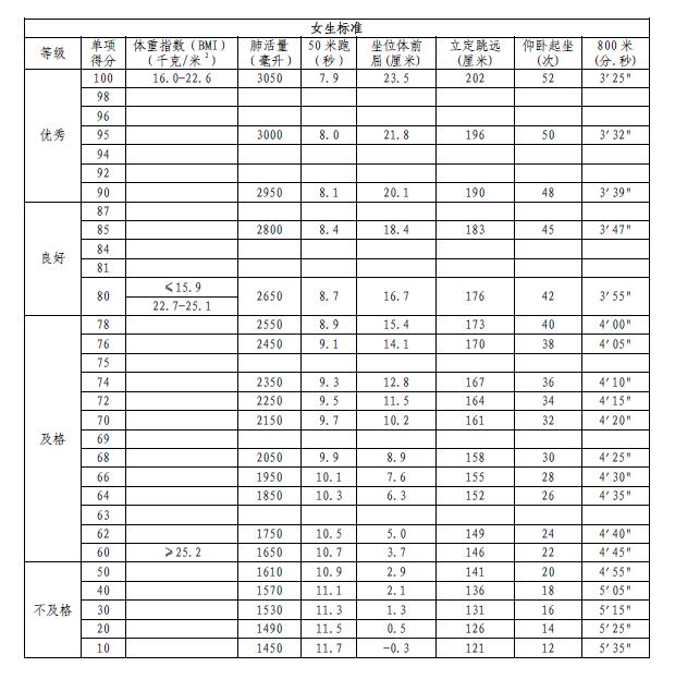 (三)毕业测试评分标准执行《国家学生体质健康标准(2014年修订)》标准相关评分表的规定。男生引体向上和1000米跑,女生1分钟仰卧起坐和800米跑单项指标可以依据《国家学生体质健康标准(2014年修订)》中加分评分标准予以单项加分,但体育与健康考试毕业测试最终得分不得超过60分。
