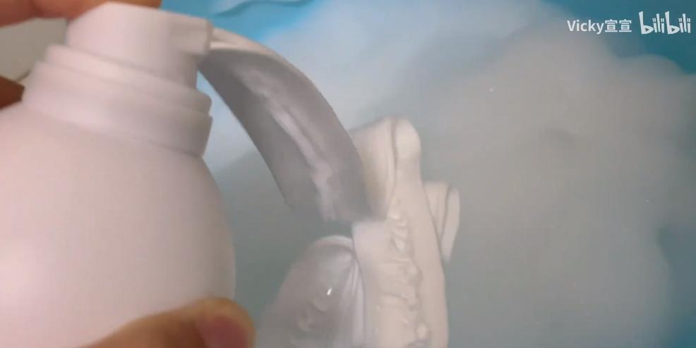 第二步,轻轻拨动水面;第三步,挤出慕斯,