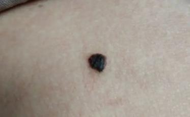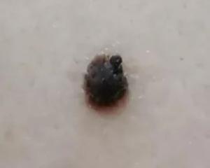 女,70岁,左胸上部深色突出,形状不规则,最大直径0.5厘米。不知什么时候长出来的,知道已有几年,今年好像比去年略大了。