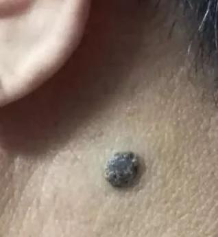 男,79岁,痣黑色,直径约6~7毫米,表面稍有凸起且偏硬,位于颈部左耳斜后下方约2厘米处。已有很多年,自己无感觉,近来偶有痒感,但自觉无其他症状。