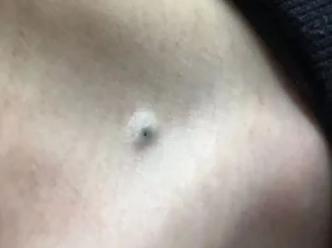 女,41岁,痣长在左肩锁骨上方。正常情况下微高于皮肤,捏起来看直径大约4~5毫米,摸起来有一个包块。这几年大了一点。表面有个小口子,以前看到里面有黑色东西,用手挤过,有东西出来。