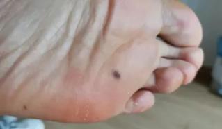 女,50岁,黑痣在脚底板黄豆般大小,手摸略有触感,表面光滑,无痛感,比之前稍有增大。