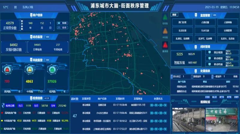 如今,借助大数据、物联网等智能化技术优势,浦东“城市大脑”正不断重塑城市治理的手段、模式和理念。“春晖路406号万家生鲜超市出现跨门经营现象,请及时处置。”浦东城管高桥中队执法队员手机上接收到了中队“微平台”推送的信息。原来,架设于春晖路点位的智能视频感知设备识别到这一违法行为。中队后台管理人员迅速介入二次甄别,确认了违法行为,“微平台”自动推送告警短信至商户负责人要求整改,并推送工单至包干城管队员移动执法终端。违法当事人在惊叹执法管理手段超高智能化的同时,承认已收到告警短信,并立即进行整改。