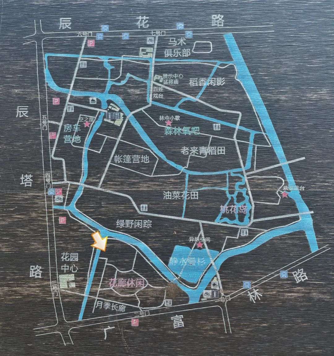 在广富林郊野公园西南角,有一处长约50米的花架,四周种植有200多株紫藤,经过多年的生长、攀爬,枝干虬劲盘旋,枝蔓在花架顶上形成了一片绿荫。每年春季紫藤花开花,串串花穗挂满枝头,淡紫色的花朵连成一片,形成一条浪漫的紫色长廊,吸引了不少游人前来打卡拍照。
