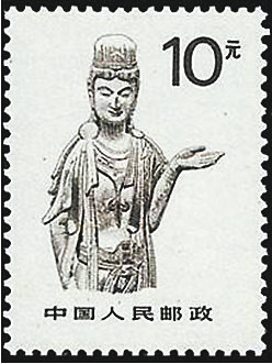 在此之前1988年发行的《中国石窟艺术》(普24)大面值邮票一套四枚,其中面值10元的一枚邮票选图即为麦积山127窟内的西魏·菩萨,菩萨造像低眉含笑,造型流畅优美,栩栩如生。邮票以单色雕刻为主,通过精细入微的雕刻,体现出我国石窟艺术的原貌,反映出石窟艺术的形神美,庄重古朴,典雅大方。