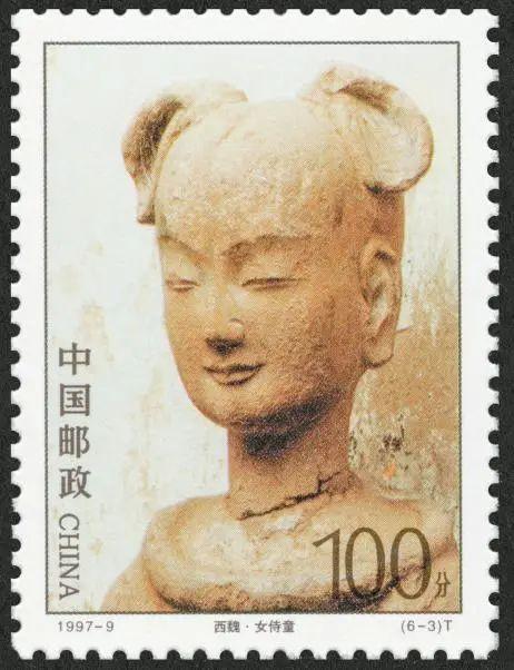 1997年6月13日,发行了《麦积山石窟》(1997-9)特种邮票,全套6枚。分别为《北魏·佛与胁侍菩萨》《北魏·胁侍菩萨与弟子》《西魏·女侍童》《西魏·佛》《北周·胁侍菩萨》《宋·供养人》。第3枚《西魏·女侍童》邮票取自麦积山第123窟,为西魏时开凿,此窟门内两角各塑一供养女童与供养男童,其中供养女童,头扎双头髻,肩挂粗大项圈,双目微闭,小嘴上翘,露出虔诚的微笑,刻画出稚气十足、聪慧俊俏的动人神态,这正是彩塑造像艺术生命所在,也是这套邮票选题的关键。