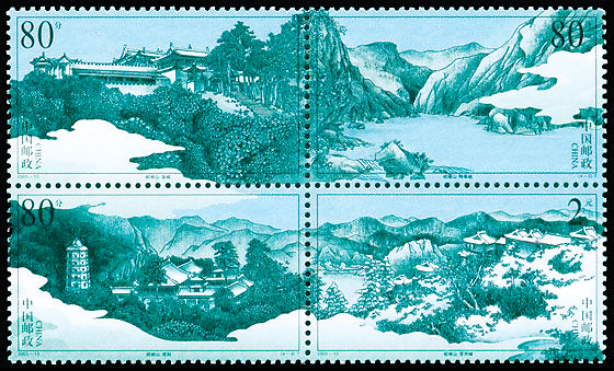 崆峒山,位于甘肃省平凉市城西12公里处,相传是轩辕黄帝问道于广成子的地方,秦始皇、汉武帝亦曾登临此山,有“天下道家第一山”之称。崆峒山山势磅礴,层峦叠嶂,峰奇石怪,林木茂盛。2003年7月26日发行《崆峒山》(2003-13)特种邮票,全套4枚,分别为崆峒山之《皇城》《弹筝峡》《塔院》《雷声峰》。该套邮票采用四方连形式,以黑白色描绘了崆峒山清静优美的景色,虽然印刷色彩并不太引人注目,但是这套邮票采用了高科技的潜形汉字防伪技术,这在中国邮票发行史上实属首创。