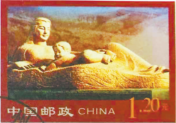 “黄河之水天上来”,她自青藏高原奔腾而下,一路挟风携雨流经陇原。黄河是中华民族的摇篮,黄河孕育了中华文明,黄河哺育了中华儿女,故又被誉为“母亲河”。在甘肃省会兰州市百里黄河风情线的南滨河路中段屹立着一座雕塑,这就是“黄河母亲”。该雕塑基座上刻有来自原始彩陶上的水波纹和鱼纹图案,反映了甘肃作为彩陶的故乡,有着悠久的历史。坐卧于黄河之上的“母亲”,长发飘飘,神态安详,右侧有一活泼可爱的男孩依偎在其身旁,这座雕塑寓意深刻,象征着古老的黄河像母亲般哺育了华夏民族,生息繁衍。2002年12月20日,《雕塑——黄河母亲》普通邮资封在兰州首发,这枚普资封也是甘肃省申请的首枚专用邮资图加印封。