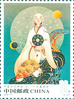 2019年8月6日,《中国古代神话(二)》(2019-17)特种邮票之《伏羲画卦》首发式在羲皇故里天水举行。此枚邮票的主图案“伏羲画卦”是中国古代神话传说故事。相传伏羲常坐天水卦台山巅,仰观日月星辰的变化,俯察山川风物的法则。有一天,他眼前出现了一派美妙的幻境,渭河对岸的龙马山豁然中开,但见龙马振翼飞出,悠悠然顺河而下。太极神图深切映入他的意识之中,彻底洞穿了天人合一的密码。伏羲氏在天水卦台山一画开天,可以说是他把人们当时所处的未知世界,变成了一个可知世界。