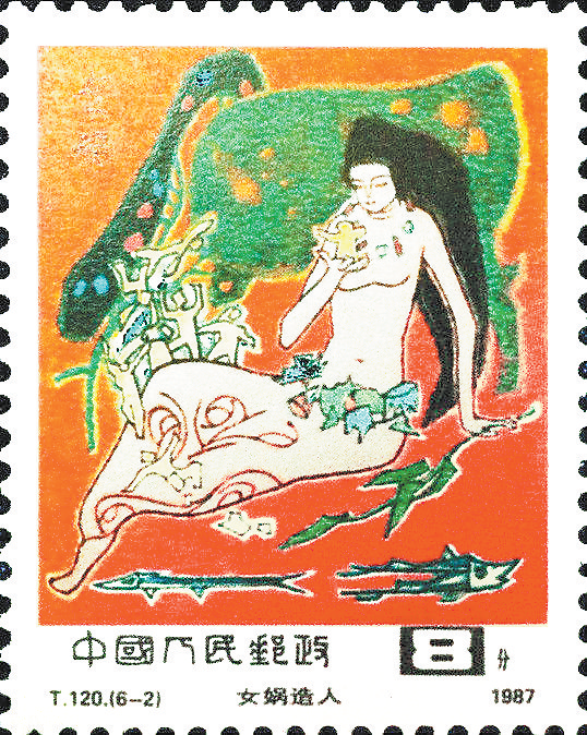 而女娲邮票要比伏羲邮票发行早32年,1987年9月25日发行的《中国古代神话》(T120)特种邮票全套六枚中的第二枚即为《女娲造人》。邮票所表现的是女娲造人的形象,画面通过夸张的人物造型以及中国国画与现代艺术的融合,突出了女娲柔美的一面,同时还为我们展示了一幅远古风情的图景。
