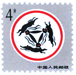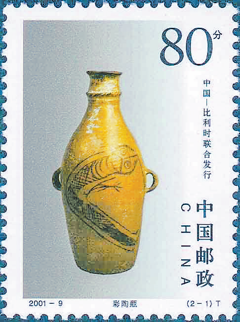 1957年,天水市甘谷县西坪乡出土了人面鲵鱼彩陶瓶,该瓶为新石器时代仰韶文化庙底沟类型的晚期彩陶文物,1996年9月被国家文物局鉴定为国家一级文物,现藏于甘肃省博物馆。2001年6月12日发行《陶瓷》(2001-9)特种邮票全套2枚,其中第一枚即为“人面鲵鱼彩陶瓶”。