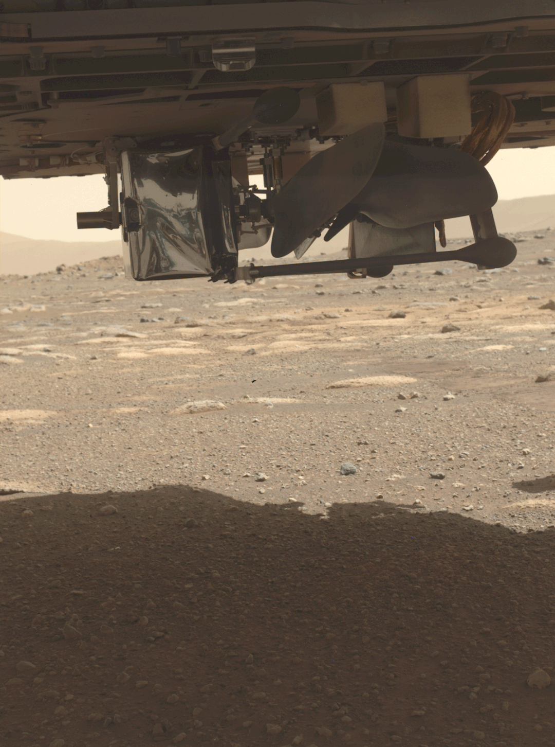2021年4月4日,毅力号后避障相机拍摄,注意此时机智号的旋翼还在锁定状态 | NASA/JPL-Caltech/PIA24541接下来,就是机智号在火星大展身手的时候了。
