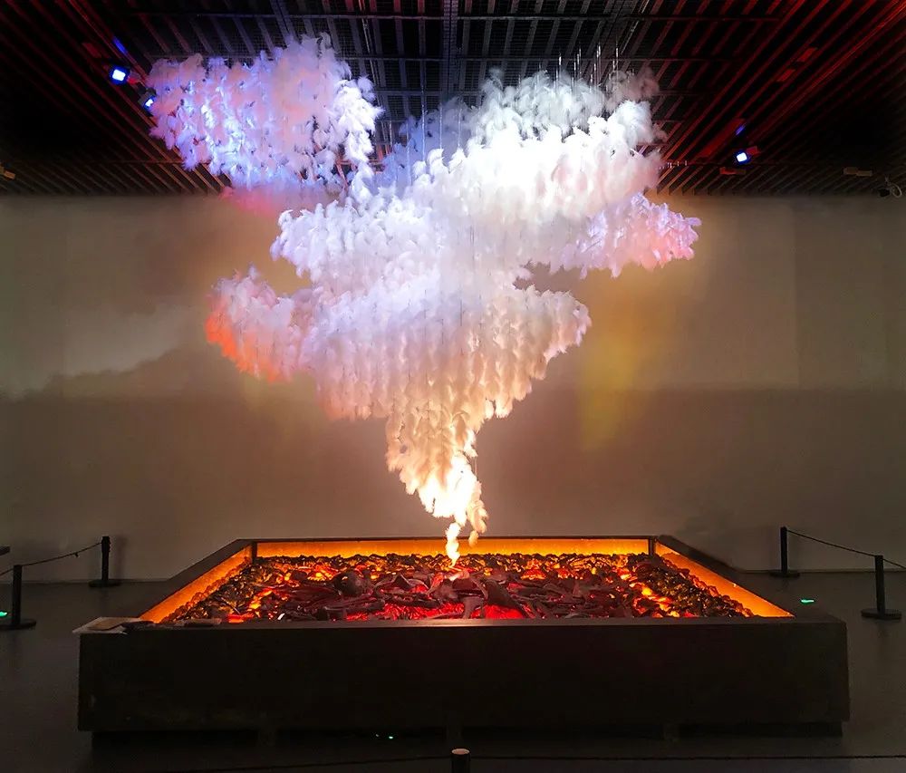 进入大厅是大型装置作品《烟》,地上是骨头堆砌起来的火堆,黑色的骨头里透着红色,以3D的技术营造出火焰的效果,现场就如堆堆白骨被烧红,火苗烧起来,生命化作青烟,烟飘到空中,化作羽毛一样的团团云朵,生命消失了。地上红色的火苗、空中洁白的羽毛,现场的视觉效果是很美的,却又传达出了一种悲剧的力量。这件作品在一个6x6米的空间里,周围是玻璃,观众进不去,只能透过玻璃去观看和体会空间内的氛围,观众可以面对作品留言,参与作品的互动。