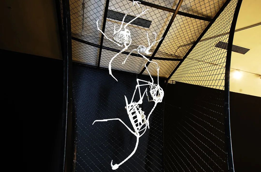 展览最后的收尾是一件反吊鸟的雕塑,巨型的鸟骨形体,8.6米高的架构,光打到上面,地面上铺了一面镜子,观众走到镜子边上,低头看,鸟和自己都在镜子里,我想说的是:照见了你我。