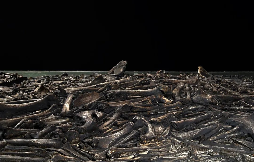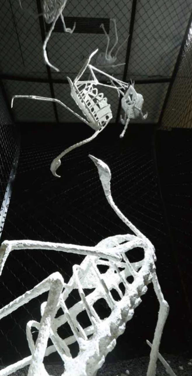 冯放将在今日美术馆打造一个大型的能量场域。进美术馆前的钢架斜面上,近5米的不锈钢“候鸟”以展览的主形象迎接观众;进入展厅,16米长的浮雕“殇”让人想到被杀戮的候鸟族群的命运;封闭空间里大型装置“烟”呈现美好被毁灭的悲剧力量;8.6米高构架内的反吊鸟骨雕塑及地面镜子表达现实世界“照见”你我。