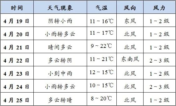 预计未来一周我市有两次降水过程,19~20日阴有小雨,23~24日小到中雨转小雨,其余时段多云或晴。