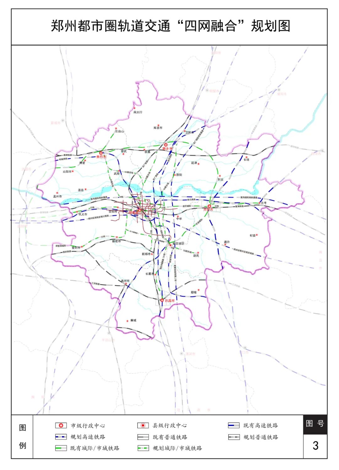 (3)郑州至焦作走廊轨道交通4条:既有郑焦城际、京广铁路,规划轨道交通S3线、S4线。